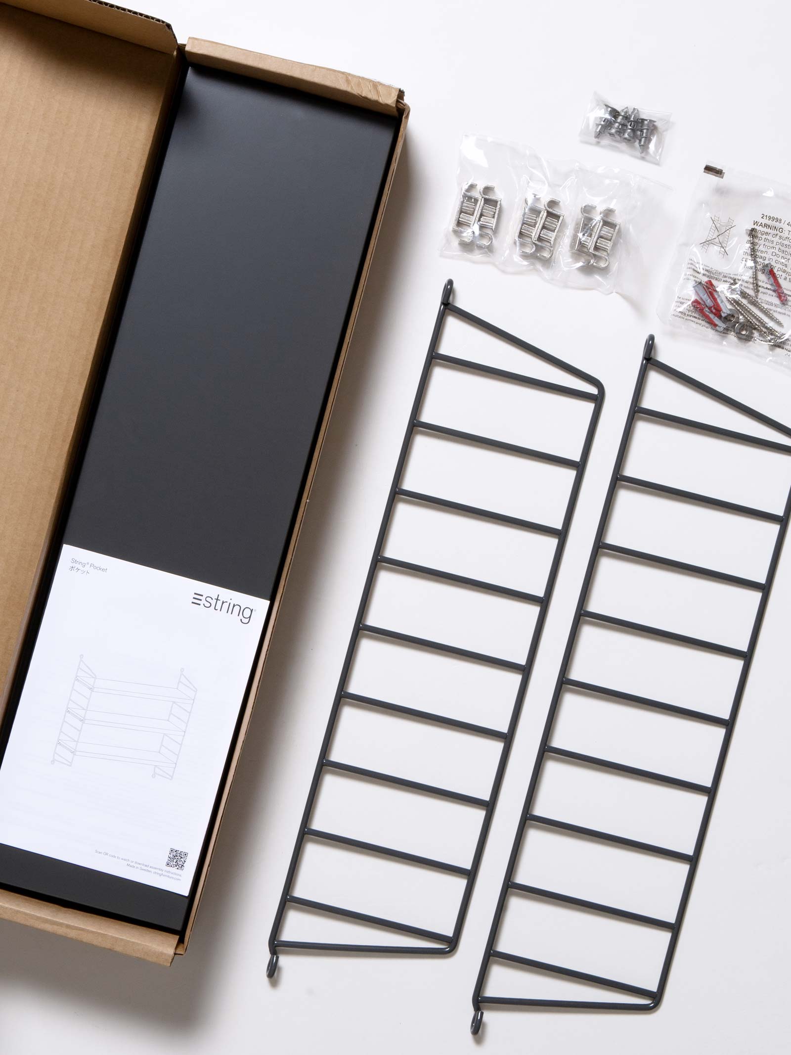 棚板を好きな位置に配置します。右下のネジ止めを最後にすることで、サイドパネルが若干動くので棚板入れがスムーズ。最後に右下をネジ止めして完成です。