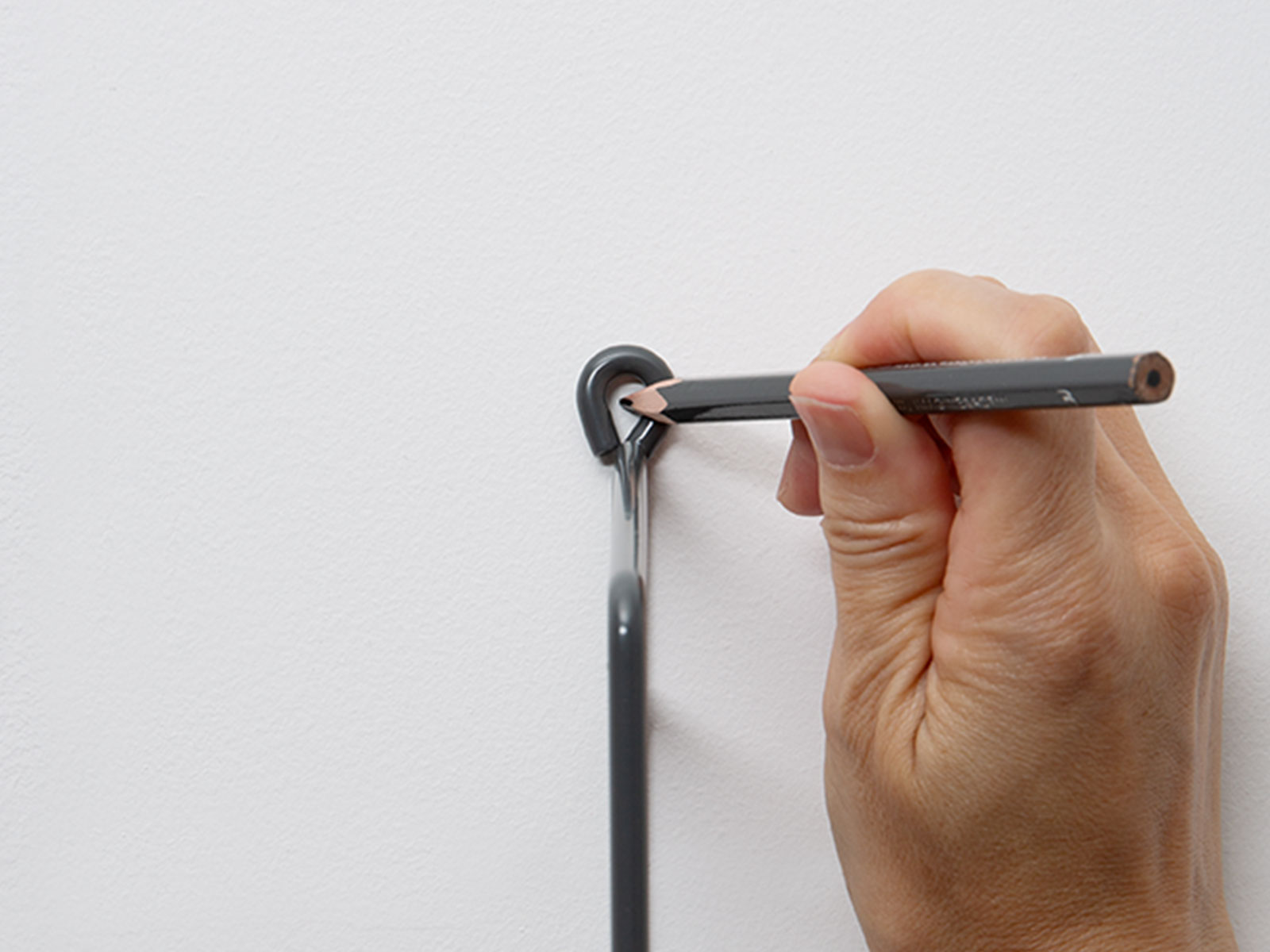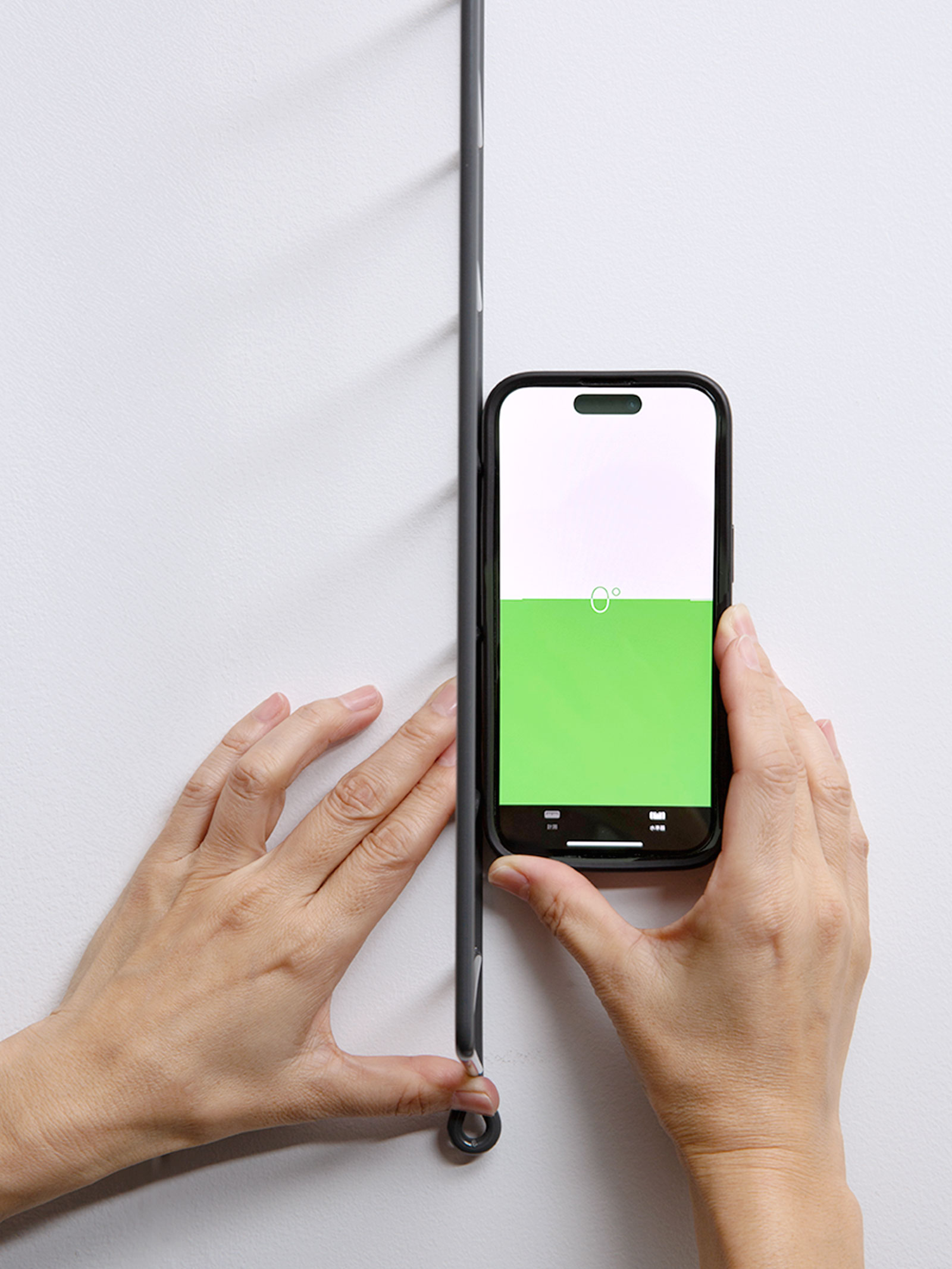 水平器を使って左サイドパネルを垂直に配置。下のネジ止め位置に印をつける。※水平器はスマホのアプリで代用可能。カメラレンズ、スマホカバーによる傾きを調整してご利用ください。