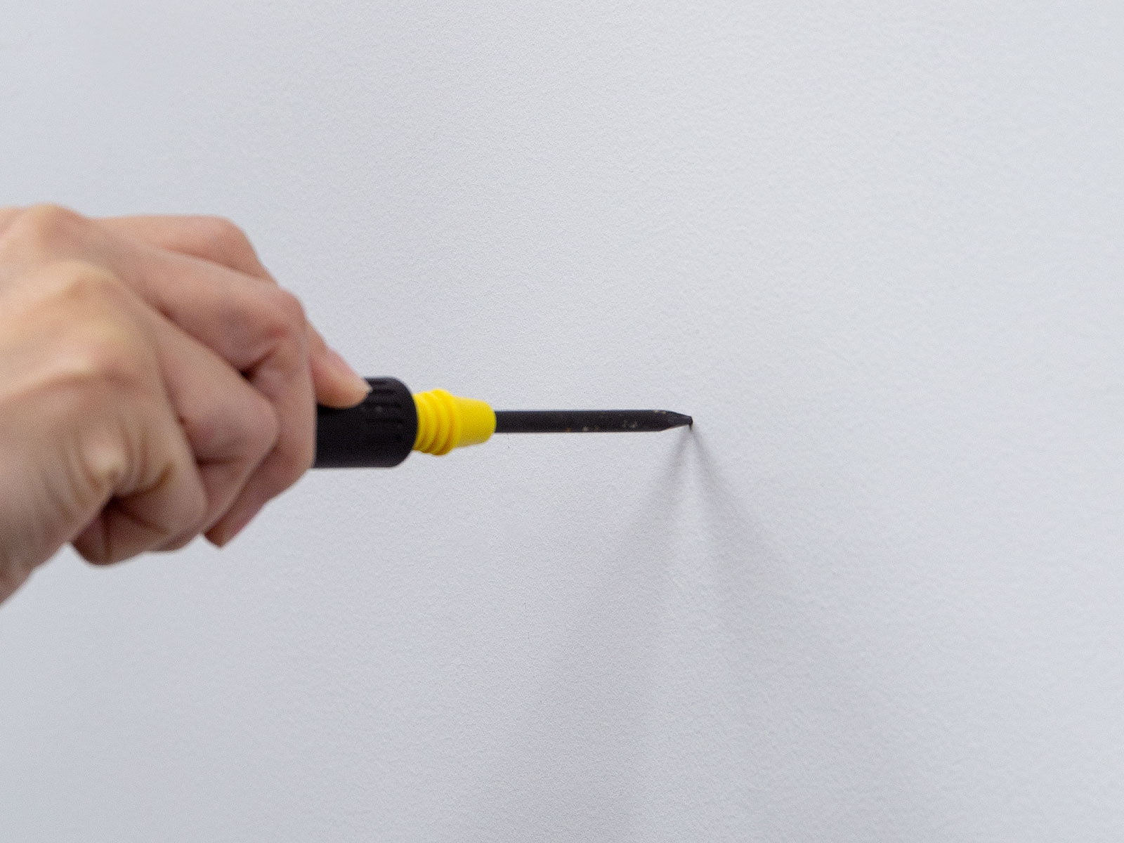印の上からキリで下穴を開けます。下穴を開けるとネジが真っ直ぐ入りやすくなり、仕上がりが美しくなります。木が硬い場合や割れてしまいそうな場合は、ネジの直径の70%程度の電動ドリルで開けてください。